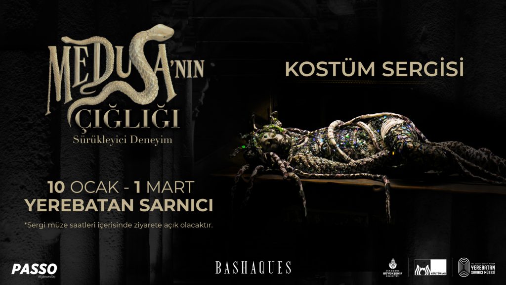 Organized by Istanbul Metropolitan Municipality Culture Inc., the exhibition showcases magnificent costumes used in the immersive experience of “The Scream of Medusa” within the 1,500-year-old Basilica Cistern. Directed by Başak Cankeş, one of the pioneers of “Wearable Art,” the exhibition features a collection that explores the applicability of a dance performance from a dialectical perspective, inspired by mythology.
